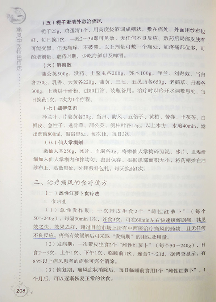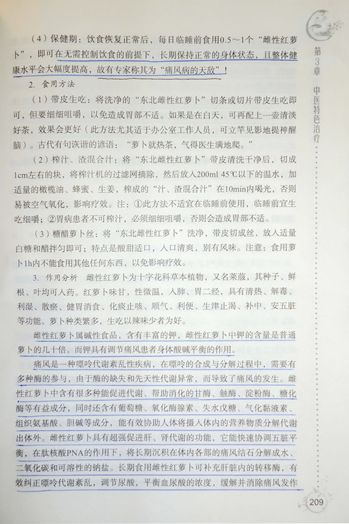 【以上為《痛風(fēng)中醫(yī)特色療法》一書中對(duì)雌性紅蘿卜的經(jīng)典論述】